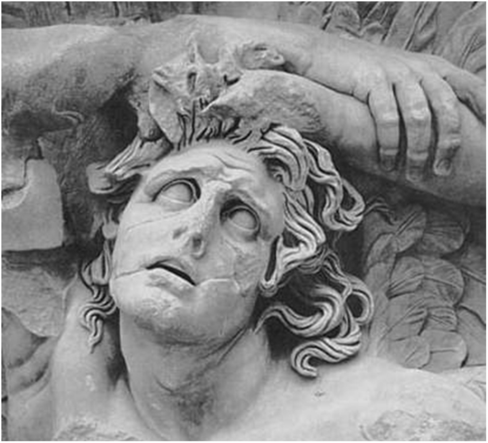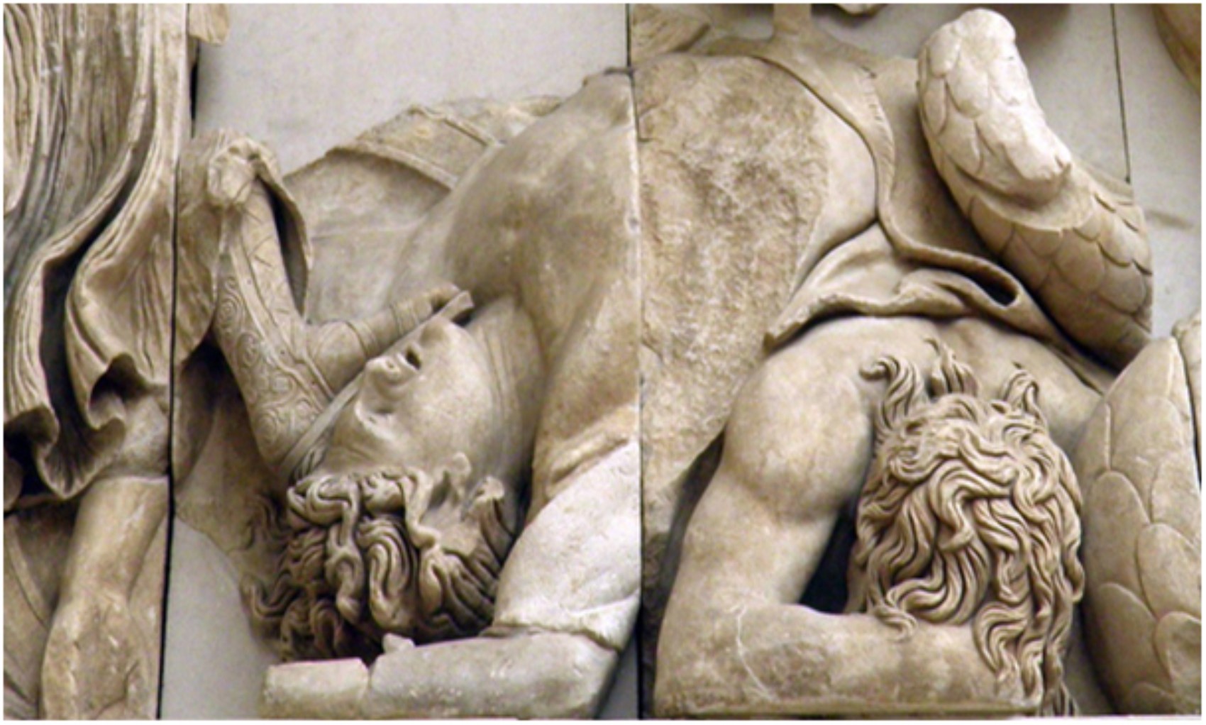 (Bergama’nın Zeus Sunağının kaçırılan muhteşem heykelimsi kabarmalarından iki gigant/devin ölümü. Berlin Müzesi/Hapishanesi)