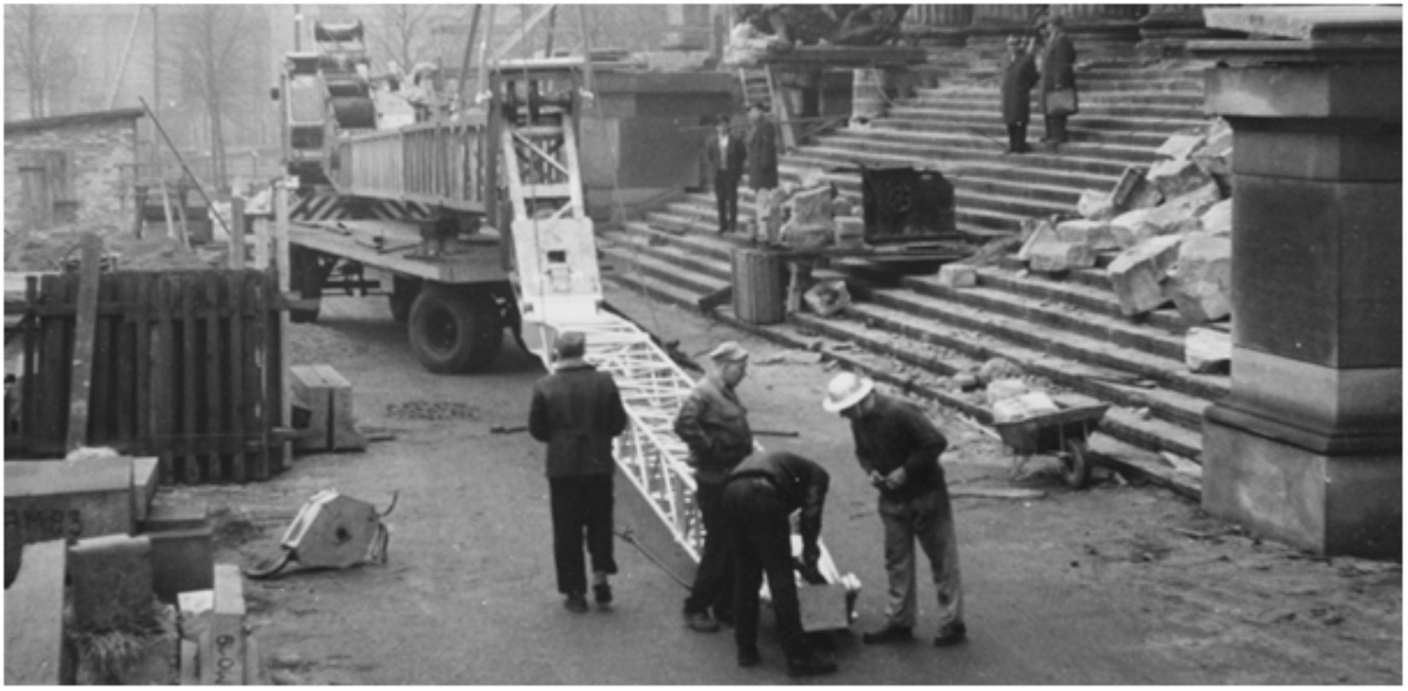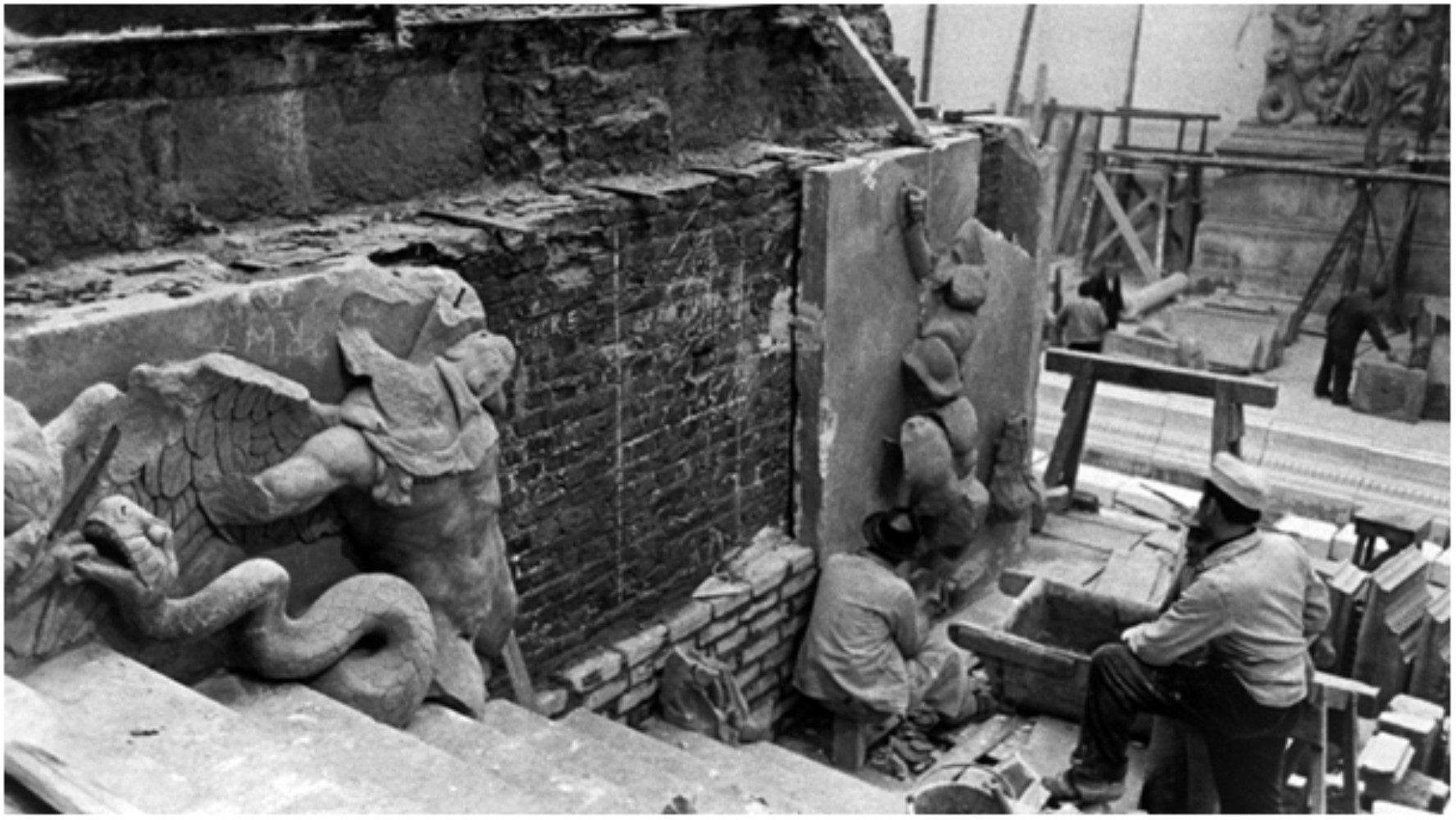 Fotoğrafta, Zeus Sunağının Rusya’dan geri gelmiş parçalarının, frizlerinMüze/Hapishanede montajı yapılıyor, bilinen yerlerine konulduğu görülüyor.