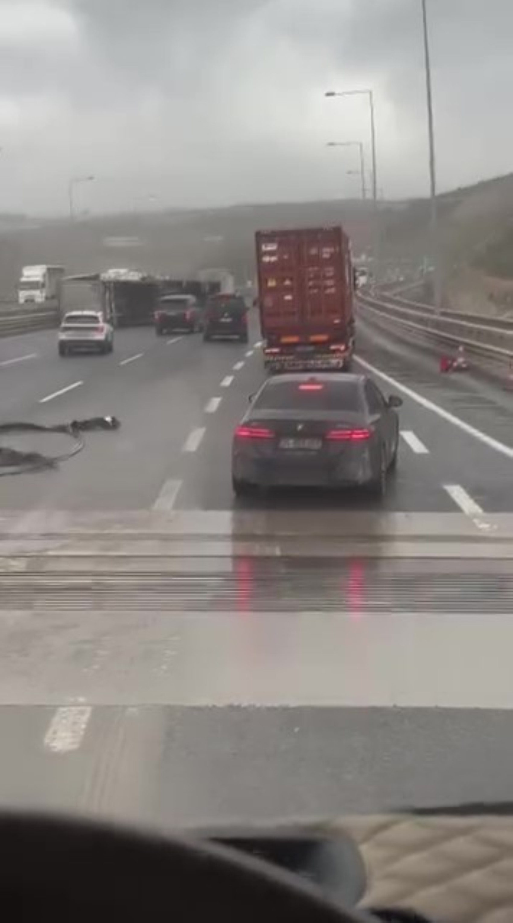 Kuzey Marmara Otoyolu'nun Kocaeli geçişinde seyir halindeki tırın fırtına nedeniyle devrildiği anlar, cep telefonu kamerasına yansıdı.